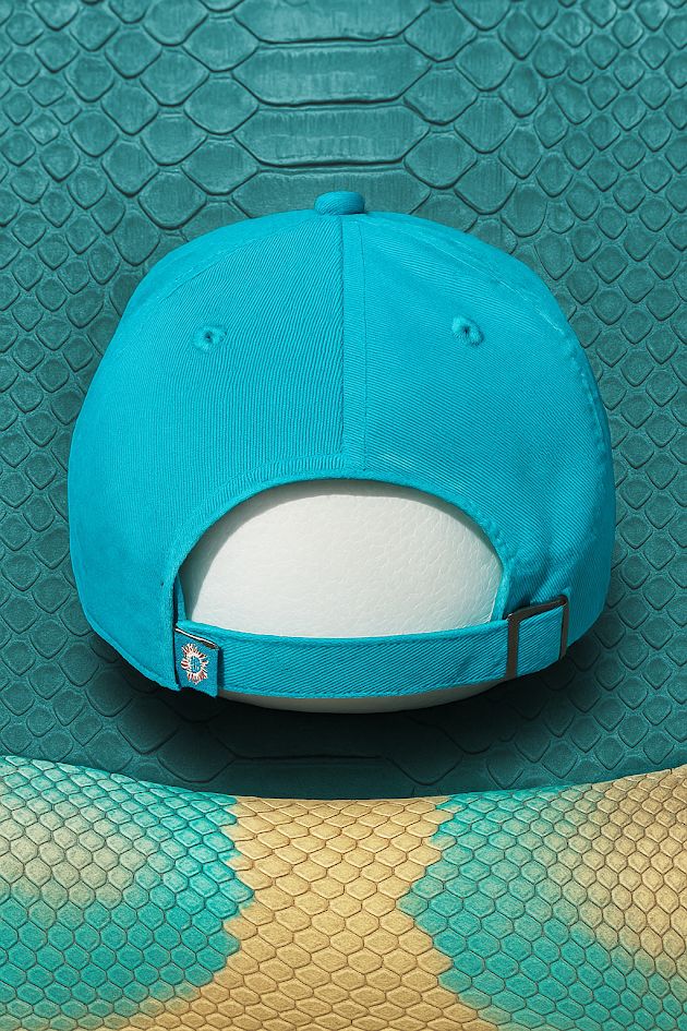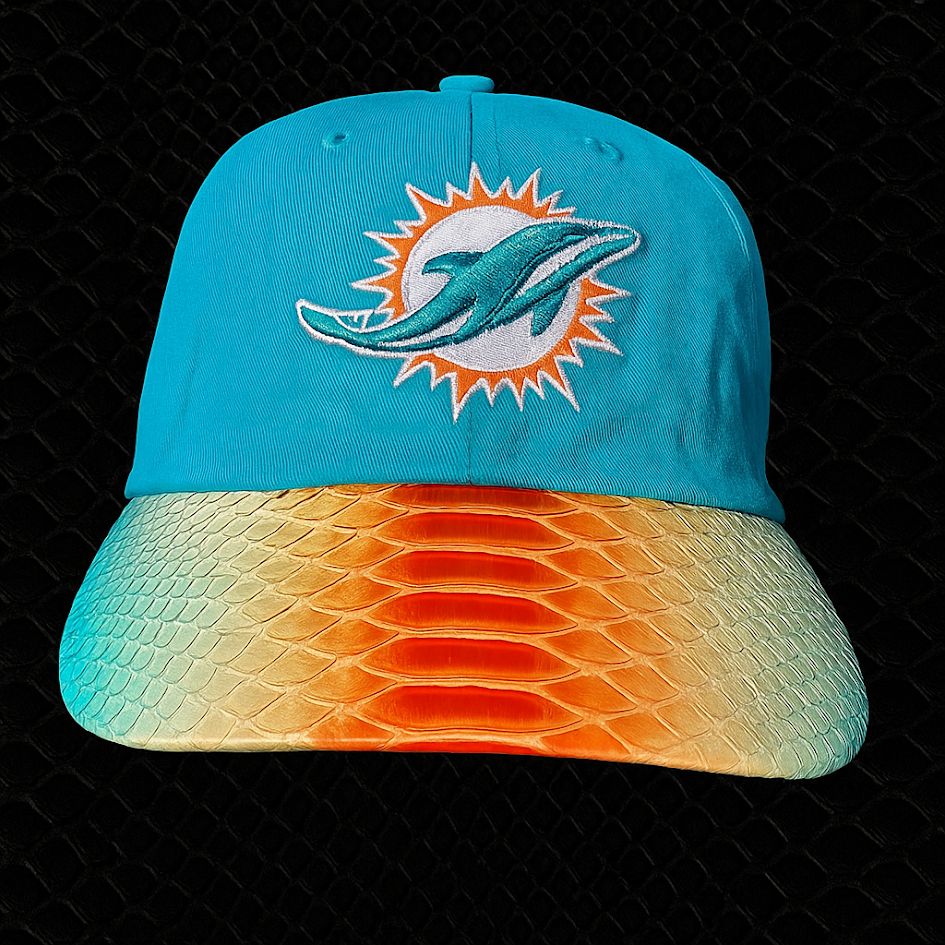 This aqua 47 Clean Up adjustable cap delivers premium craftsmanship with a striking blend of sports culture and exotic leather. The relaxed crown features official Dolphins colors with embroidered team logo front and center. But the real story is the brim—crafted from genuine python skin, finished in a Miami-inspired orange-to-teal gradient. Comfortable, adjustable, and handmade in the USA, this cap is built for fans who expect more than average. A standout in any collection.