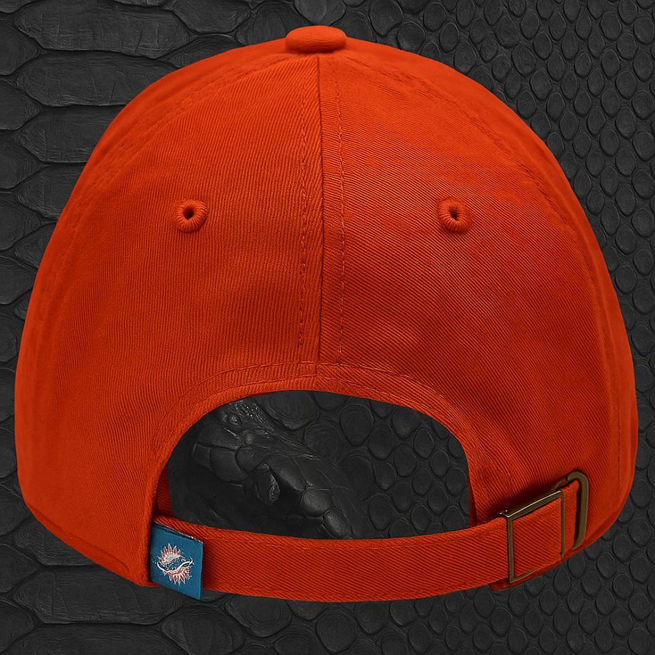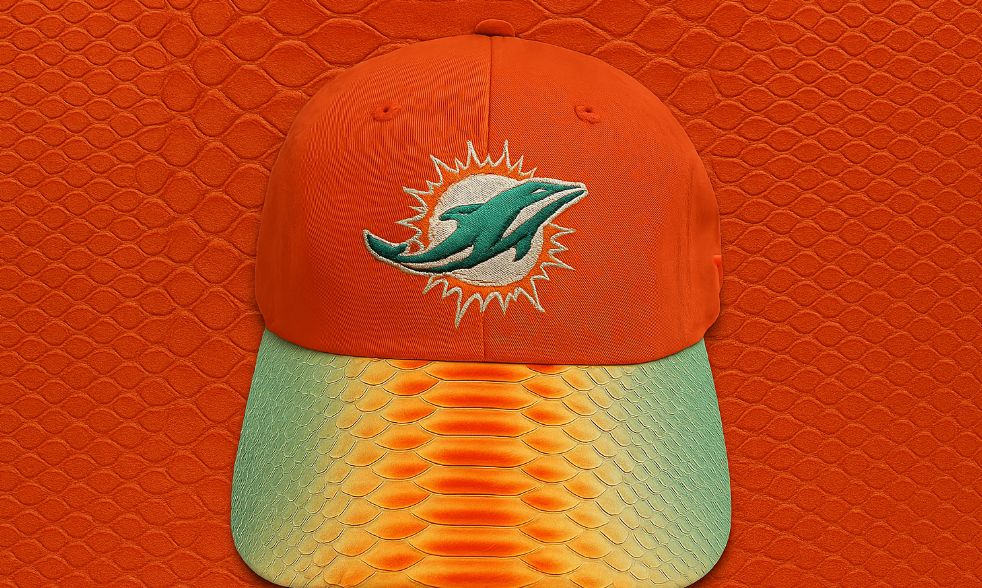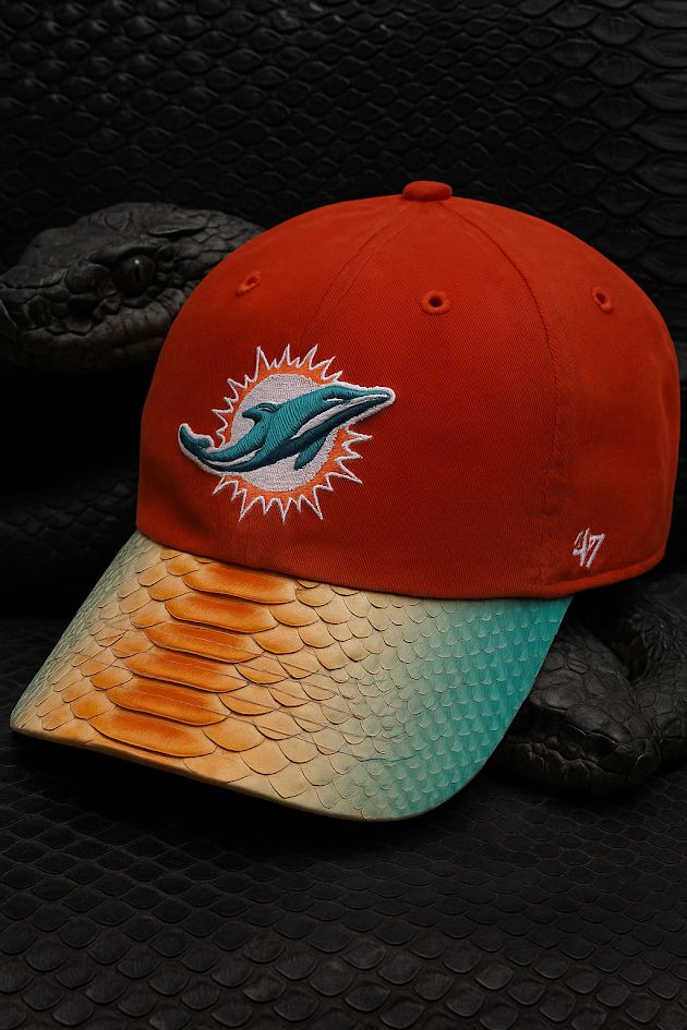 This 47 Clean Up cap combines team spirit with bold design. The bright orange cotton crown features the official Miami Dolphins logo, while the brim is wrapped in genuine python skin. Finished with a striking orange-to-teal gradient, the brim brings high-end texture and unmistakable style. Designed with a relaxed fit and adjustable backstrap, it’s a perfect blend of comfort and craftsmanship. Handmade in the USA, no two hats are alike.