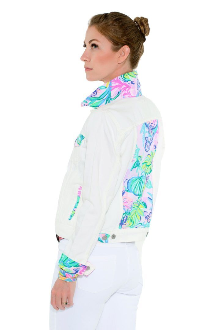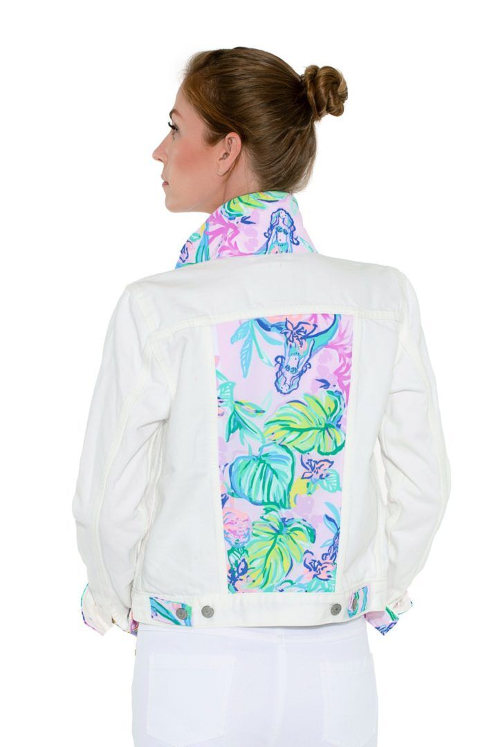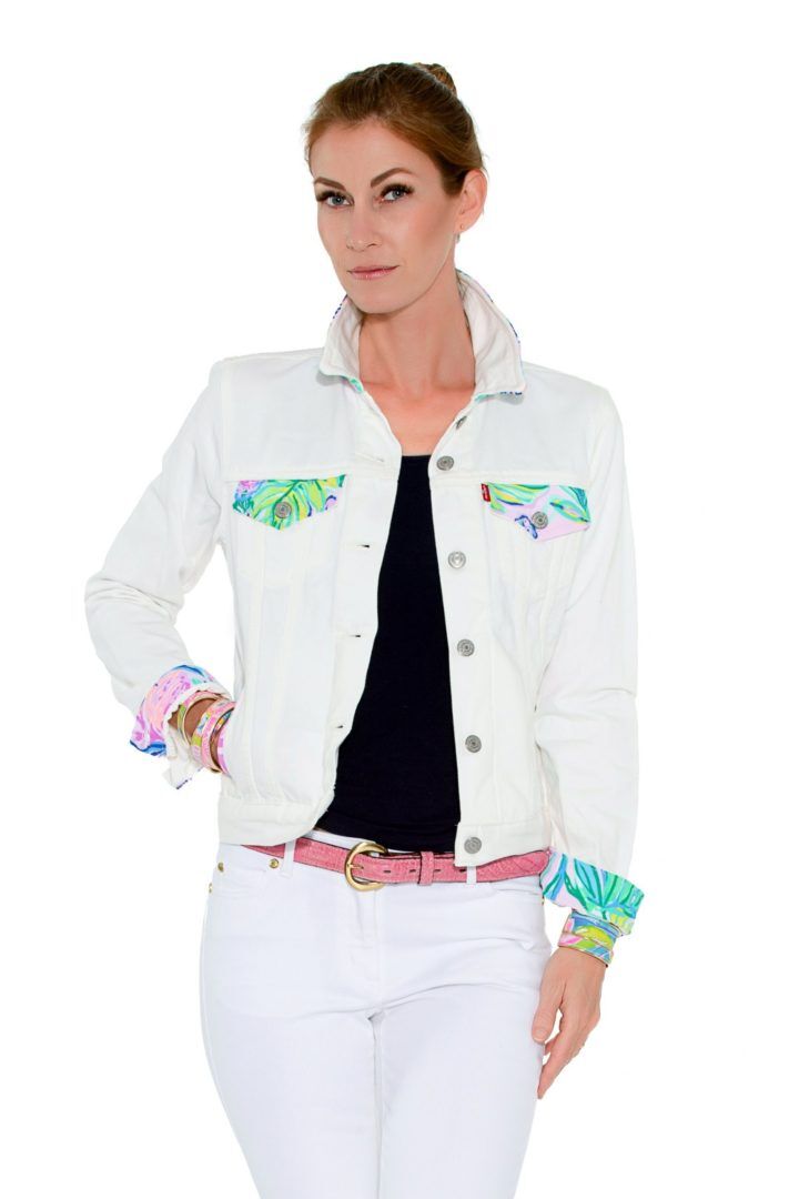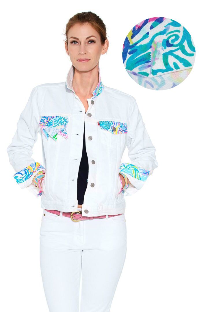 Introducing the Palm Beach Levi’s® Trucker Jacket with its unique and eye-catching design. This stunning jacket features exquisite Lilly fabric, meticulously inserted in the middle of the back, creating a captivating focal point. The absence of fabric on the front V gussets adds a touch of sophistication and showcases the Lilly fabric in all its glory.