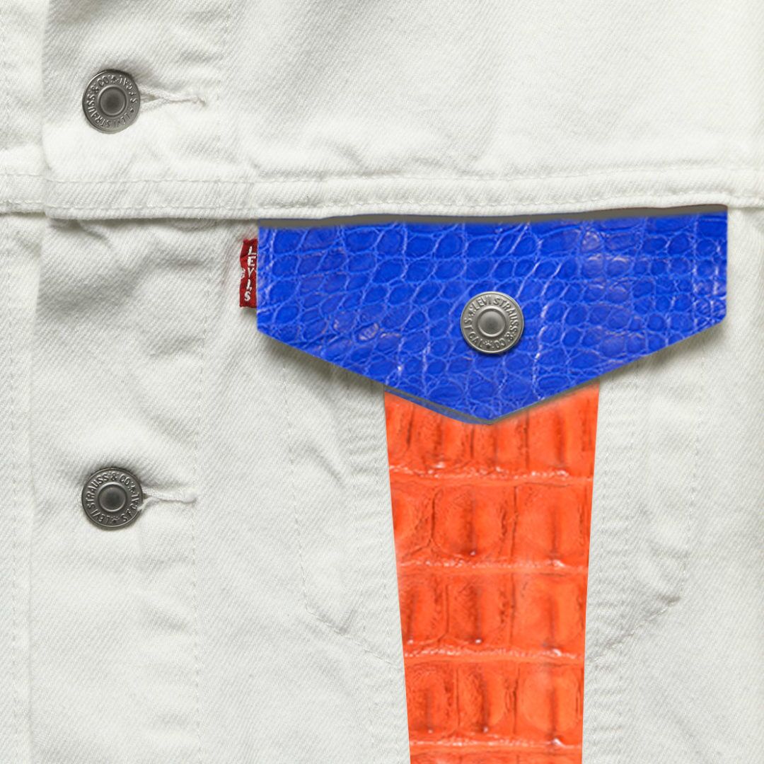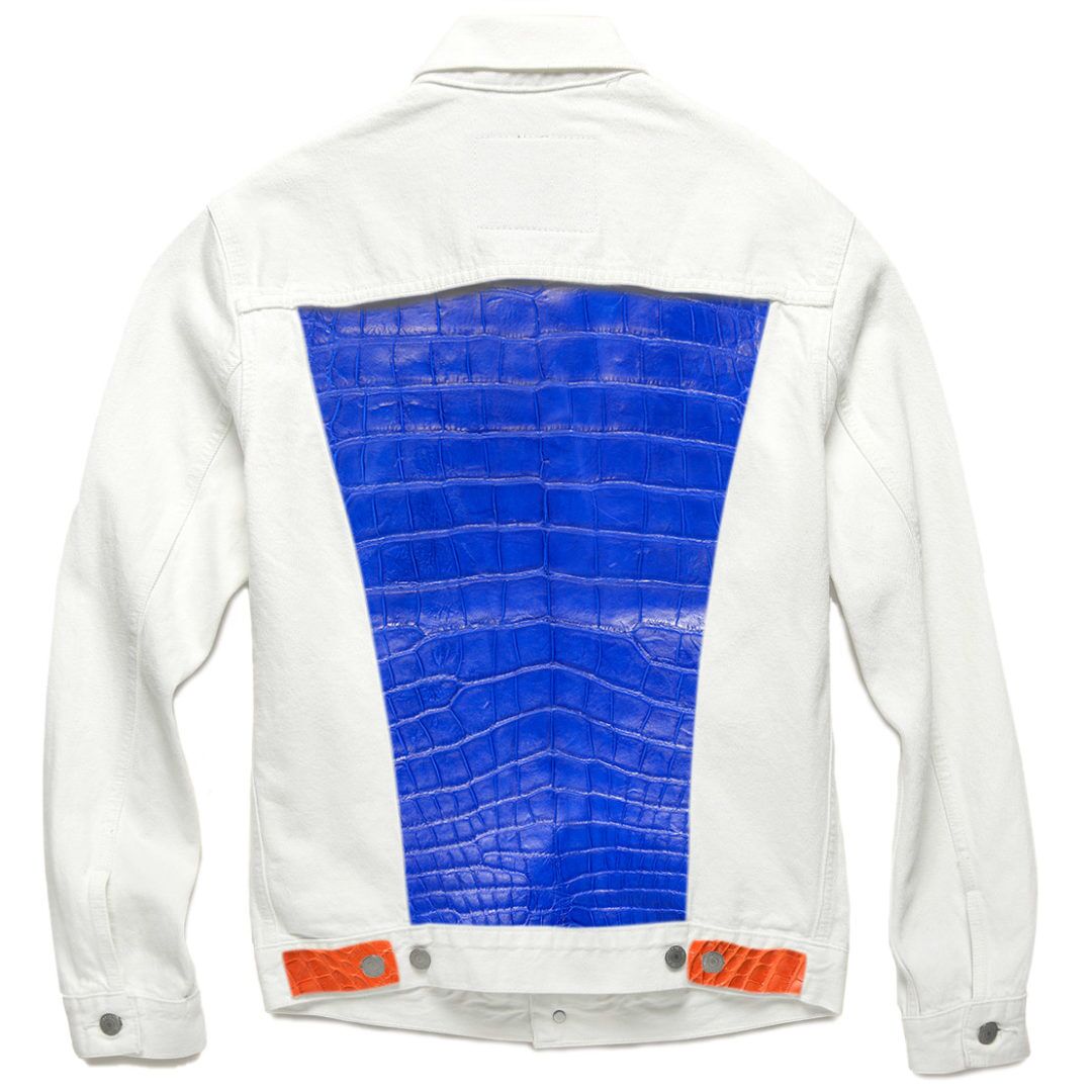This is a genuine Levi’s® Denim Jacket with genuine Florida alligator accents, in colors similar to University of Florida.